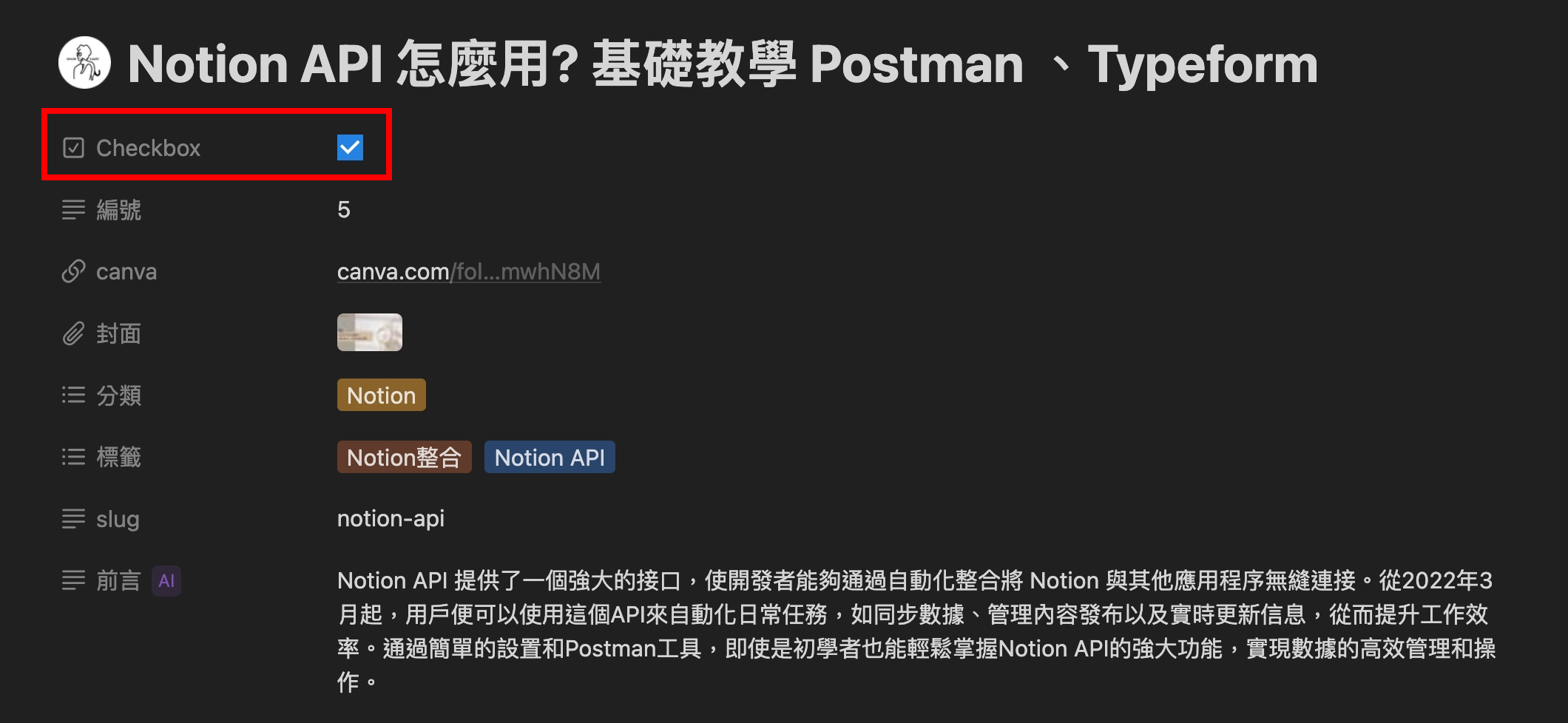 以上是個簡單的 Python 程式碼示例,請自行替換 notiondatabaseid 和 notionintegrationtoken ,並確保資料庫中有新增 Property checkbox 並且打勾。