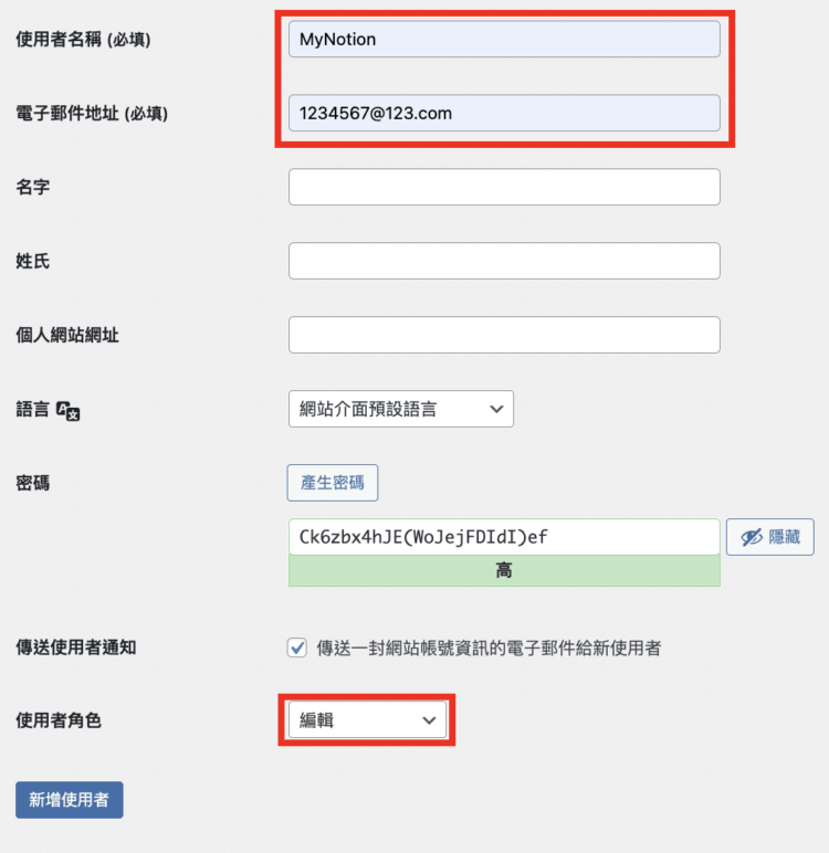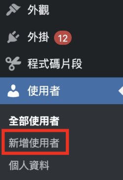 請登入自己網站的 WordPress 後台頁面,在功能欄找到「使用者」→ 新增使用者,並輸入下列設定,然後新增。