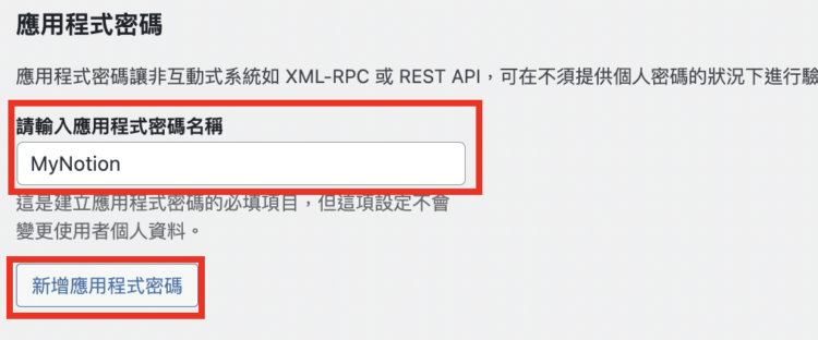 新增後,請進入其使用者的頁面,在頁面的下方找到「應用程式密碼」,新增一個應用程式密碼。