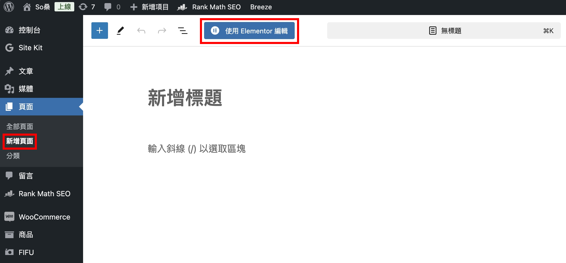 進入頁面後,我們可以在上方找到「使用 Elementor 編輯」。