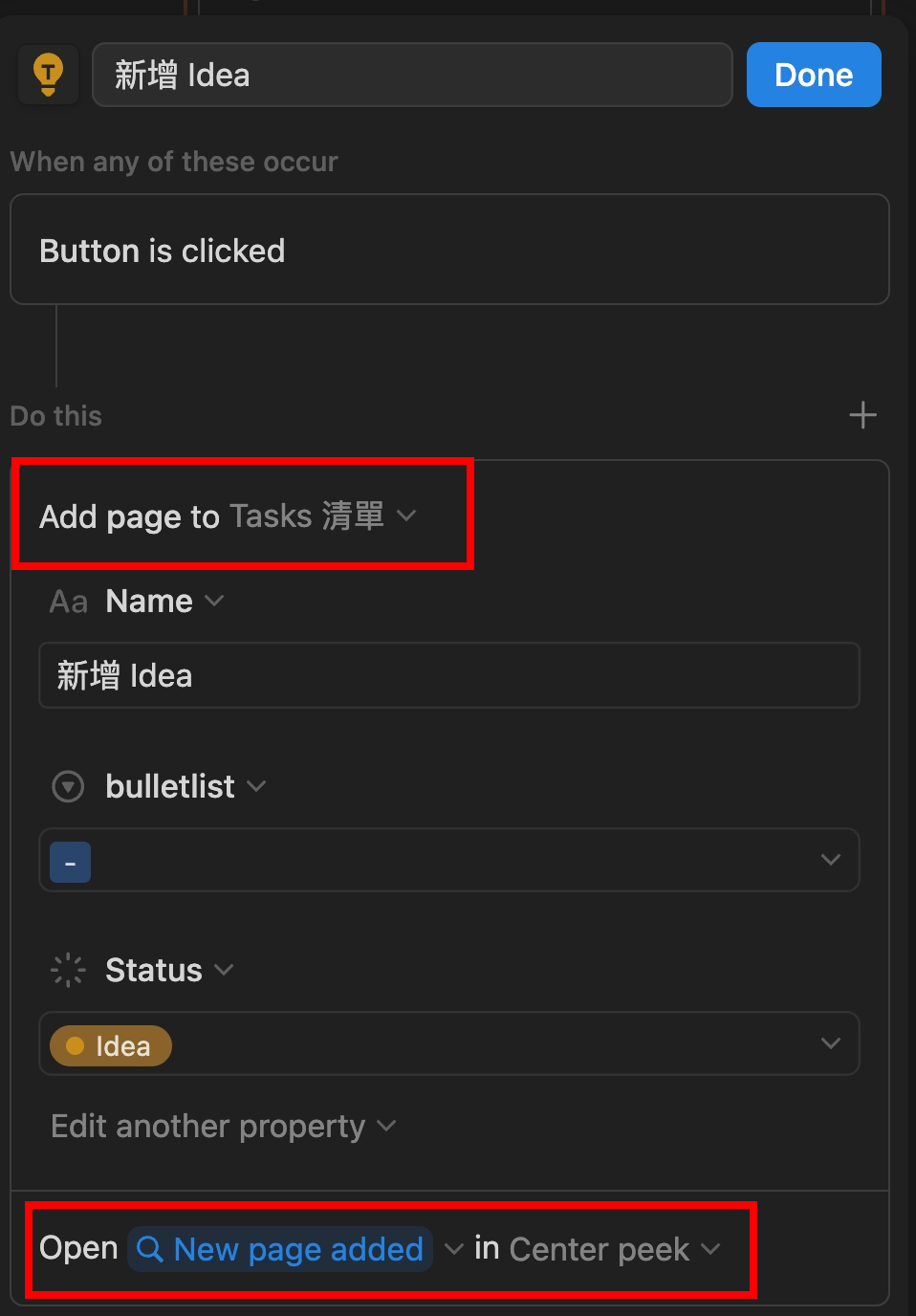 按鈕的設定如右,基本上就是 Add page 到你的閃念筆記的資料庫中,並在最後設定一個 Open New Page Add ,這樣才會直覺地打開它並使用。