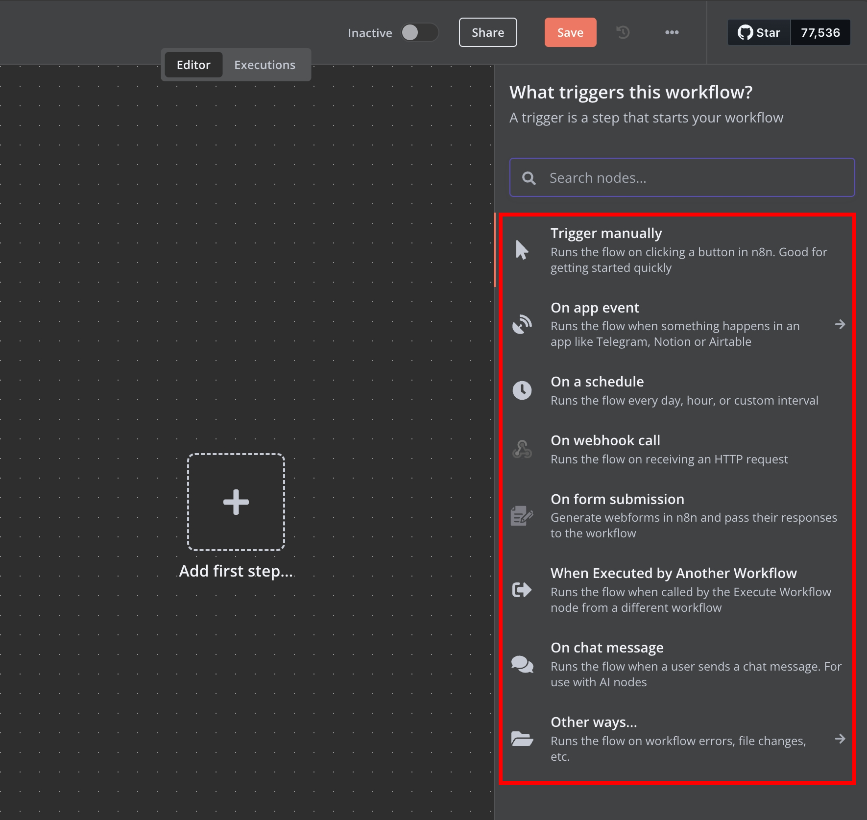 進入 n8n 主畫面後,你將看到一個空白的工作區。建議初學者從以下步驟入手: