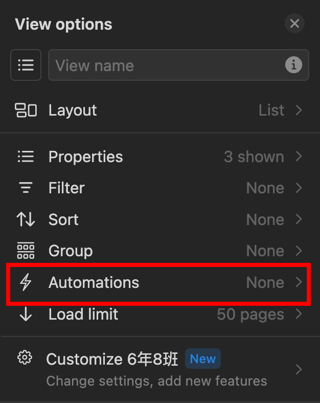 在資料庫的設定中,可以找到 Automations 設置簡單的自動化流程。例如說,我們想要完成一份文章後,送出一個 Slack 訊息到某一個頻道。到你的文章資料庫中點擊「Automations」。