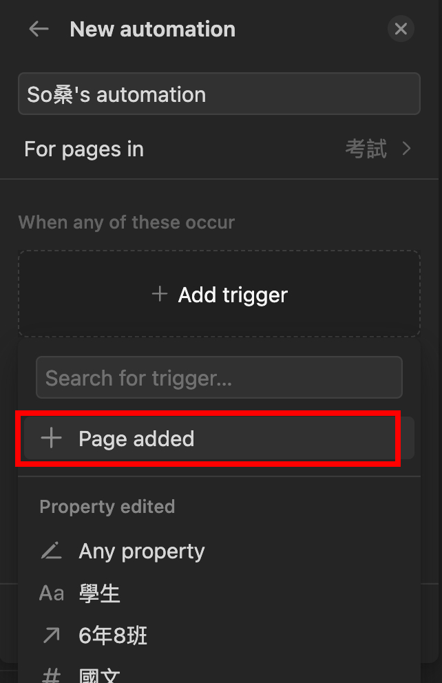 我在資料庫中設定一個條件,當 “Page added”,也就是新增一個資料項目的時候。