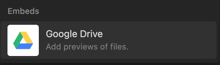 Notion 的頁面支援 Google Drive ,只要在頁面中輸入 “/Google drive” 。點擊後,連結你的 Google 帳號,然後就可以選擇你的 Google 文件或是照片。這樣,你的 Google Drive 文件就會直接顯示在 Notion 的頁面上,你可以直接在 Notion 中查看和編輯這個文件。
