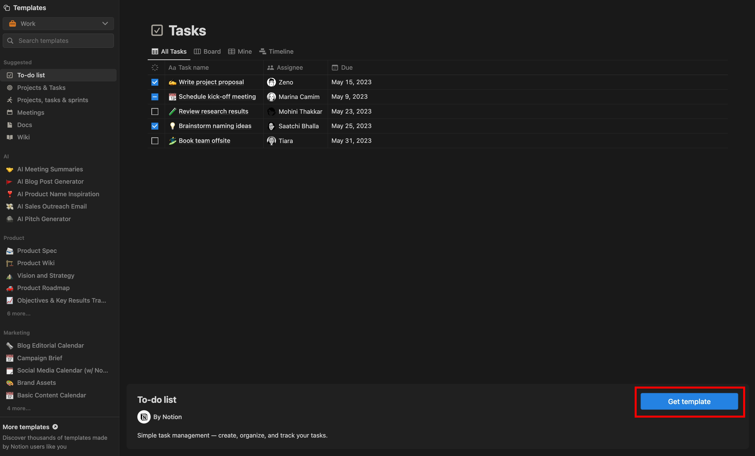 Notion Templates 的頁面,左側可以看到,有多個分類可以選擇,選擇喜歡的 Templates 之後,點擊右下方的 Get template 。