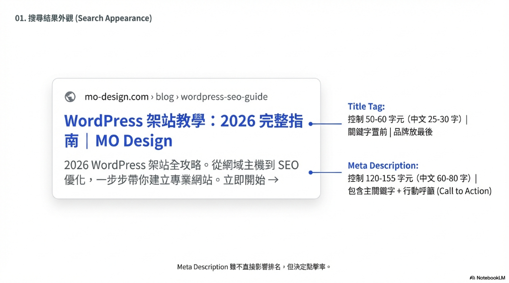 - 標題 (Title) 是點擊率的關鍵:放入主關鍵字,控制 50-60 字元