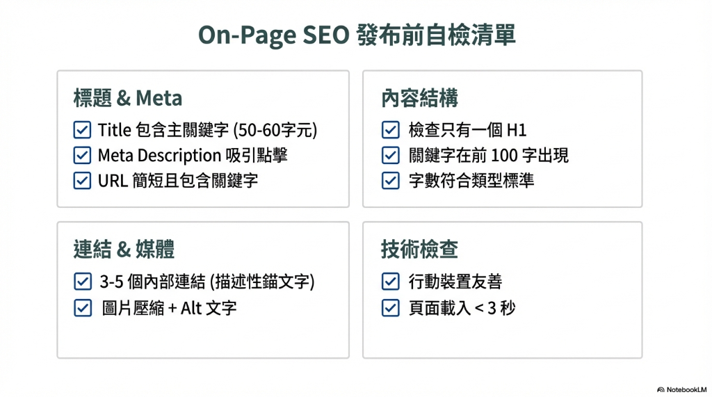 On-Page SEO 是 SEO 的基本功。這 10 個項目做好,你的頁面就具備了被搜尋引擎正確理解的基礎。
