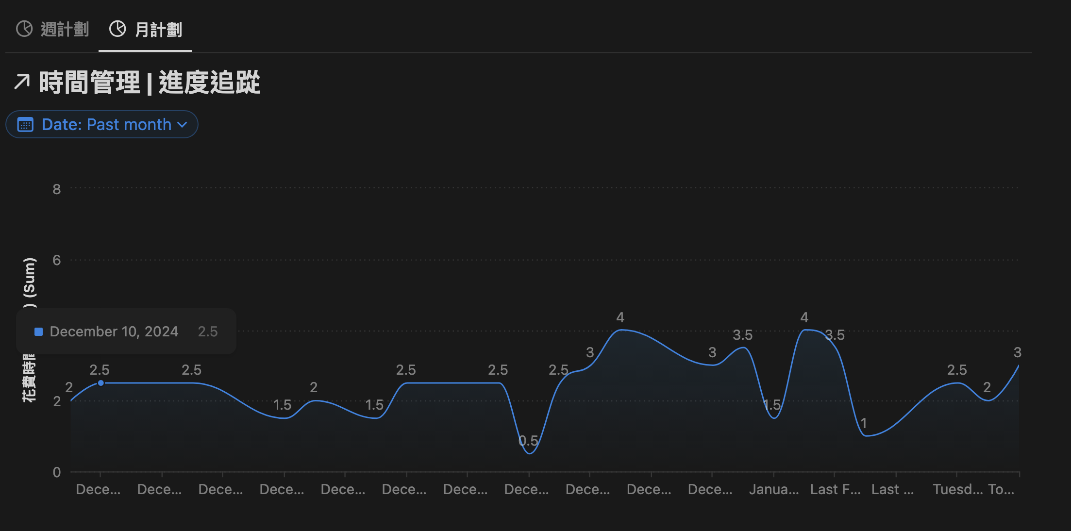 例如說,我使用 Notion 的 Chart View 記錄番茄鐘數量,精準地抓出每次任務大概會我花幾個「單位時間」,有助於我在分配時間和使用上更加有效率。
