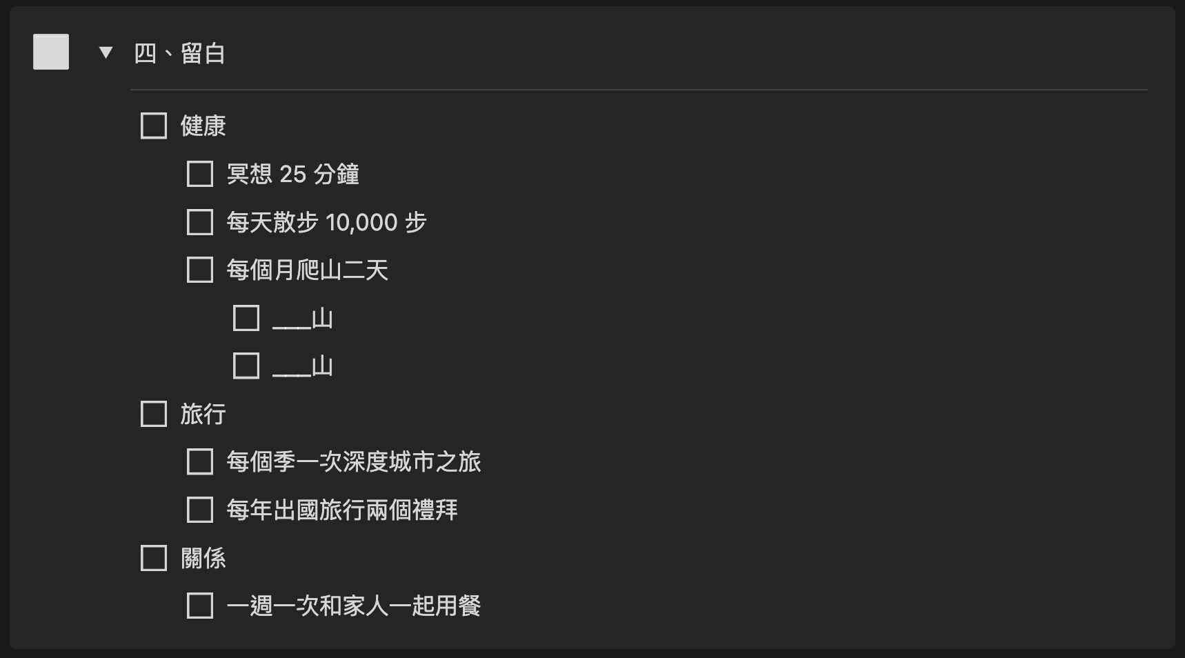 關於如何將目標變成微小可行的行動,可以參考我的文章 2025 如何打造年度計畫?從目標到執行( Notion 免費模版下載) 。