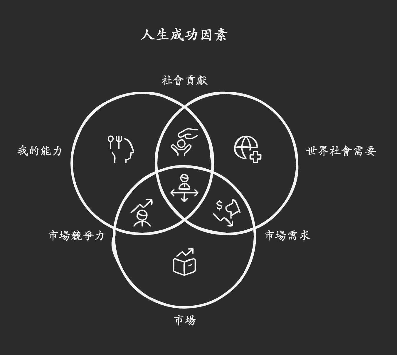 - 提高能力 → 增加收入 → 投資資產與人脈 → 貢獻社會